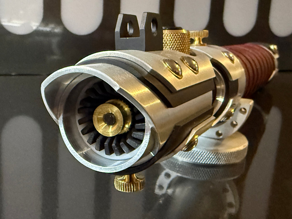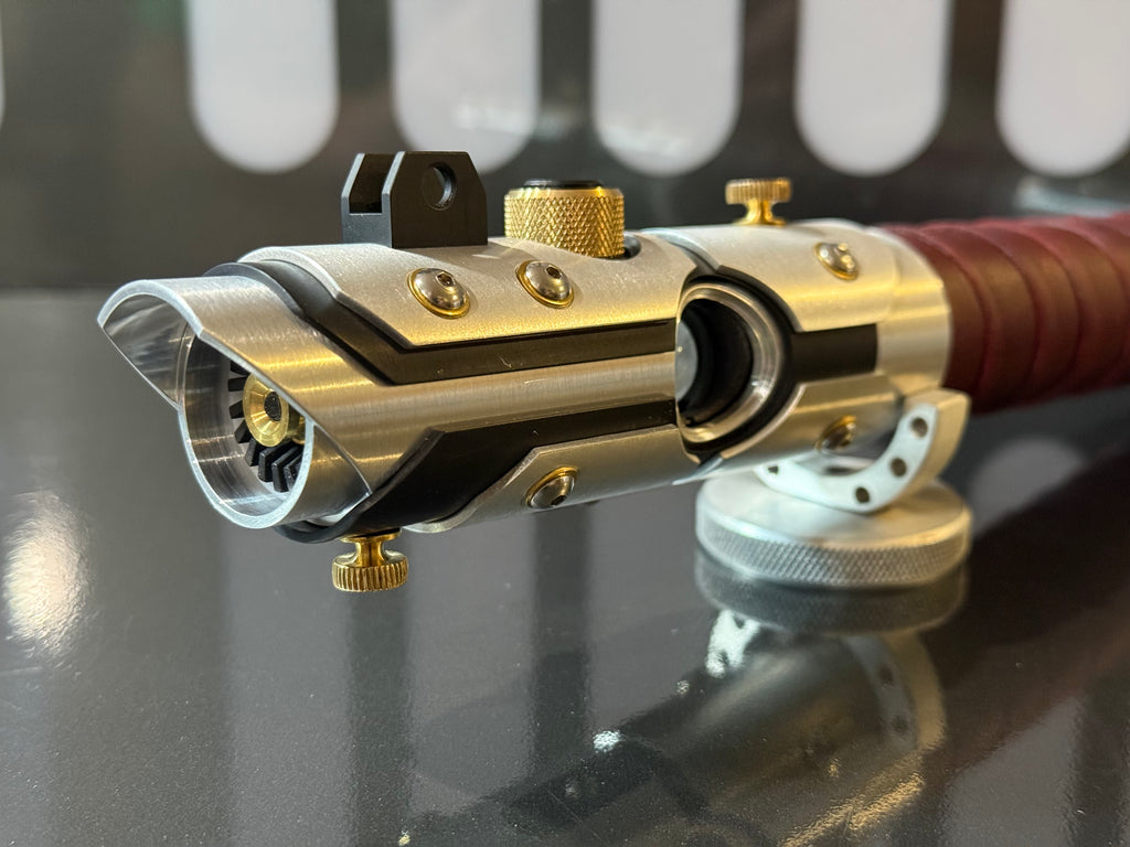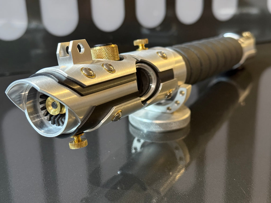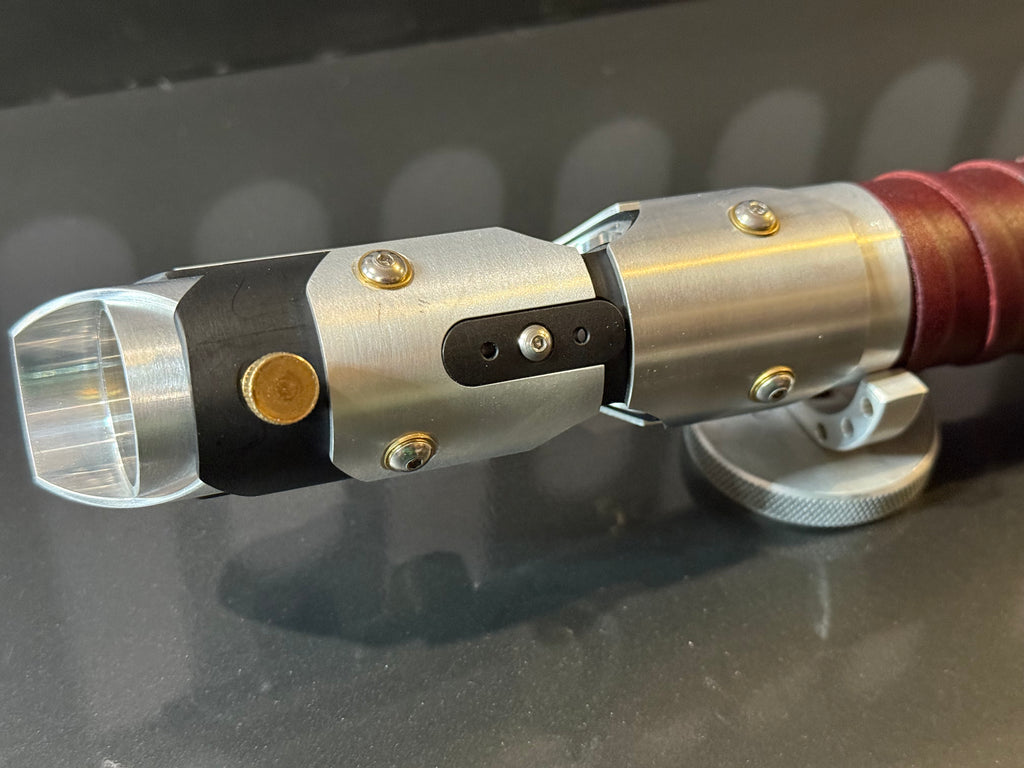 The saber is composed of 16 individual parts made of both 6061 aluminum and brass. It takes 18 individual screws and 13 brass washers to assemble! Producing this thing was quite the challenge! The grip attaches to the emitter using an L-lock system similar to the J-lock found on Graflex flashguns. While this L-lock system can be tightened down to be quite secure with the provided brass thumbscrew (or included button head screw for more comfort), this saber is not intended for anything more than the lightest of dueling.