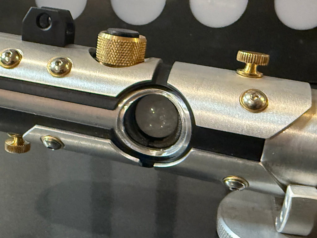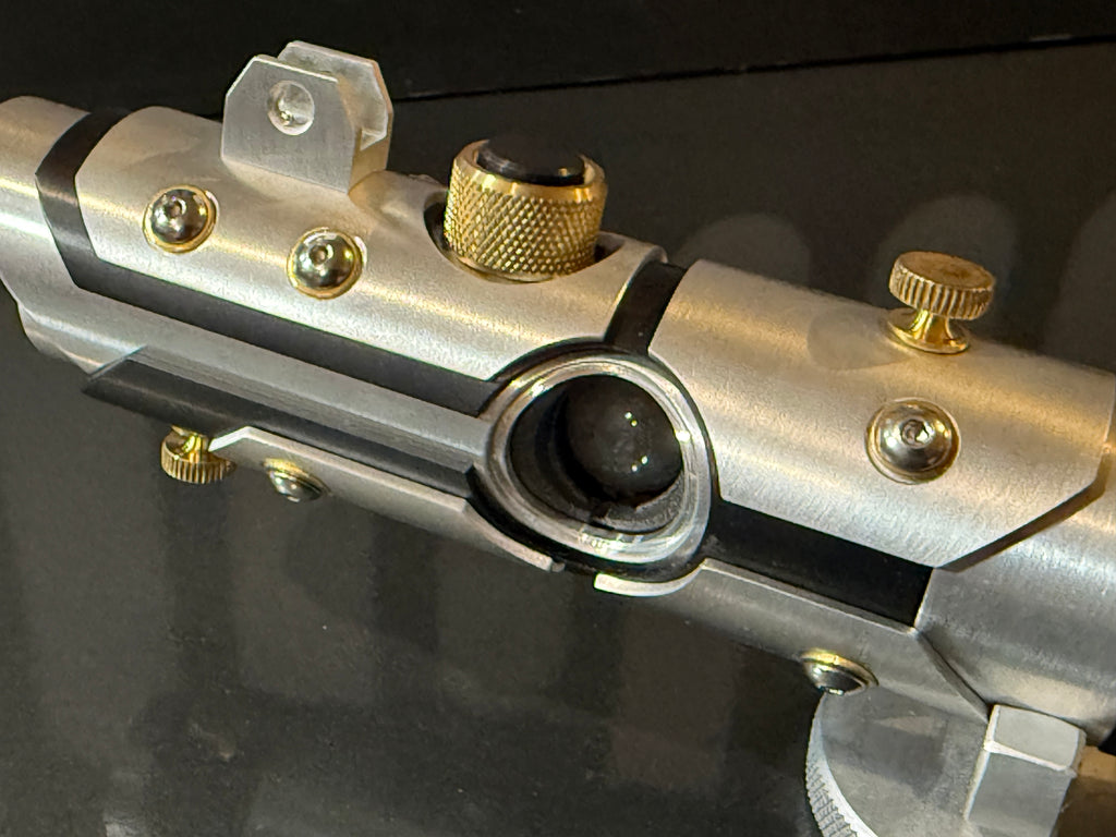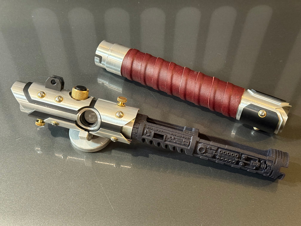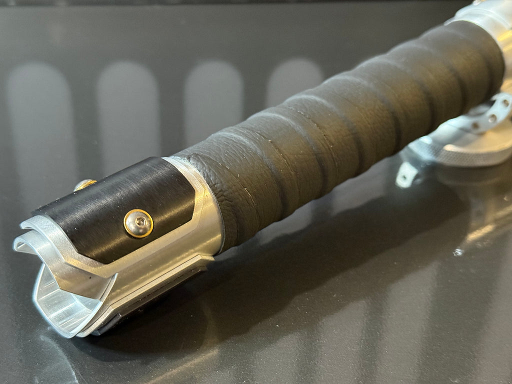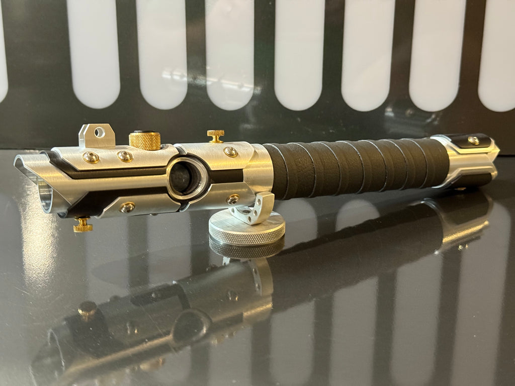 The saber is composed of 16 individual parts made of both 6061 aluminum and brass. It takes 18 individual screws and 13 brass washers to assemble! Producing this thing was quite the challenge! The grip attaches to the emitter using an L-lock system similar to the J-lock found on Graflex flashguns. While this L-lock system can be tightened down to be quite secure with the provided brass thumbscrew (or included button head screw for more comfort), this saber is not intended for anything more than the lightest of dueling.