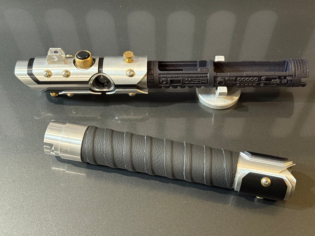 The chassis included with this hilt was designed by Tim McCarthy of Tierfon Orbital fame. It’s printed in SLS nylon, dyed black, looks great and is very durable. The front section houses the blade pixel pcb and a round 16mm glass or quartz marble. (Quartz marble included with this kit.) Assembly is completed by gluing each section together with a little E-6000 glue as you wire it up. It can be a little tricky with wire management so if you’re a novice builder, consider one of the many reputable installers to assemble and install this for you.